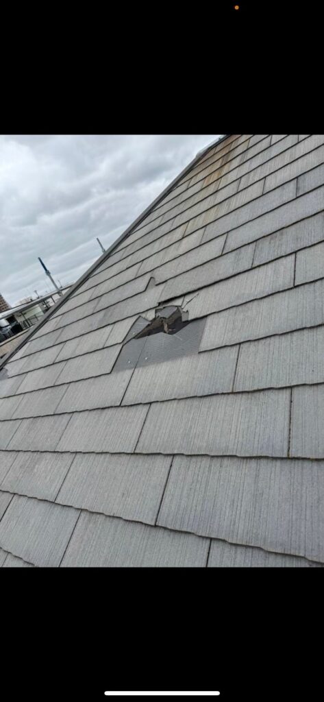 恐らく強風時に何かが飛来して屋根にぶつかったものと思われますが…