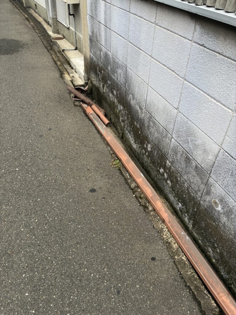 強風により2階部分の軒樋が一部飛ばされてしまったというご相談で、軒樋の交換工事をさせていただくことになりました。