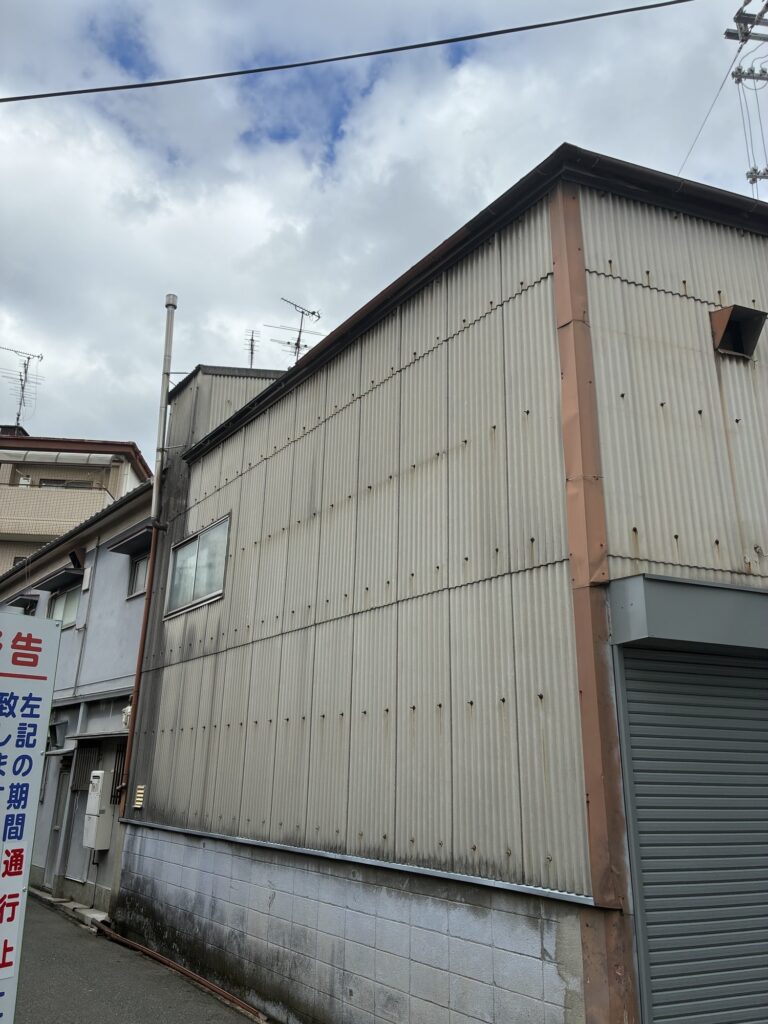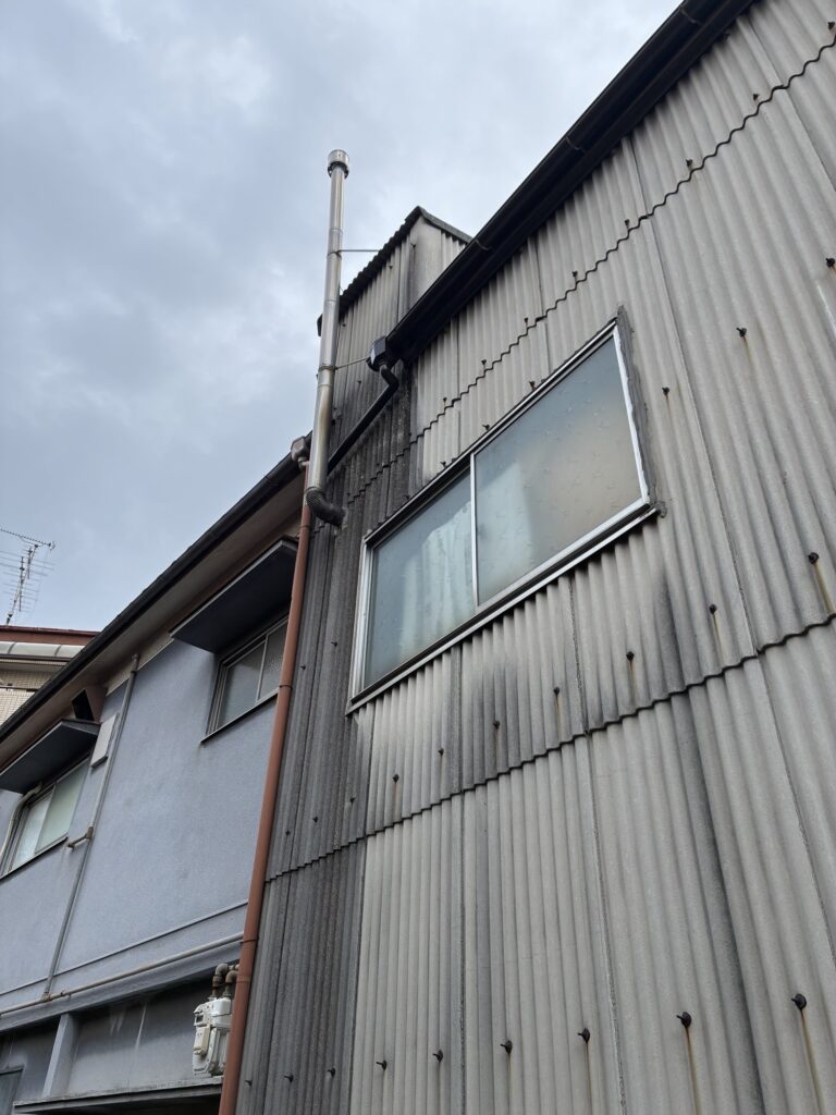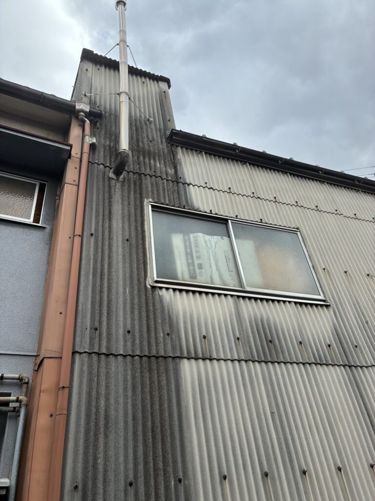 今回は建物の立地条件やその他諸事情により(建物が前面道路目一杯に建っており足場が敷地に内に建てられない上に、道幅が狭く、さらに車の往来が多い…)梯子で作業させていただくこととなりました。