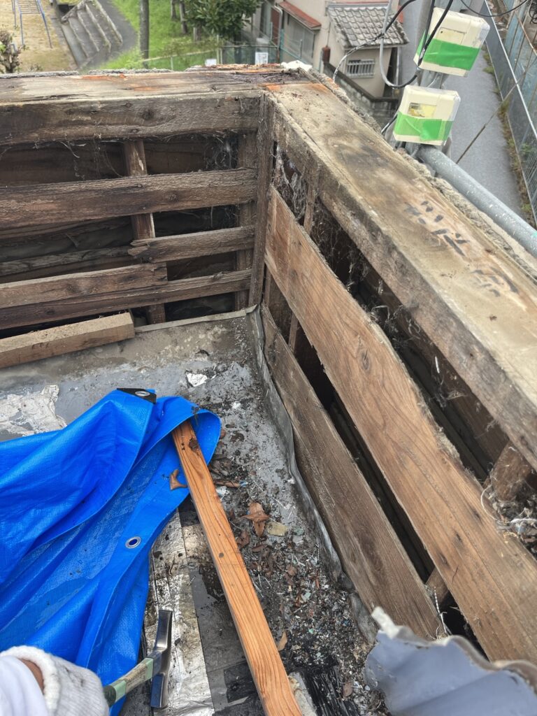 長らく雨漏りに悩まされていたお家で、造りは屋根の周囲が壁で覆われており、雨水が流れて行く水下側は「谷」と呼ばれる部材が設置されていました。