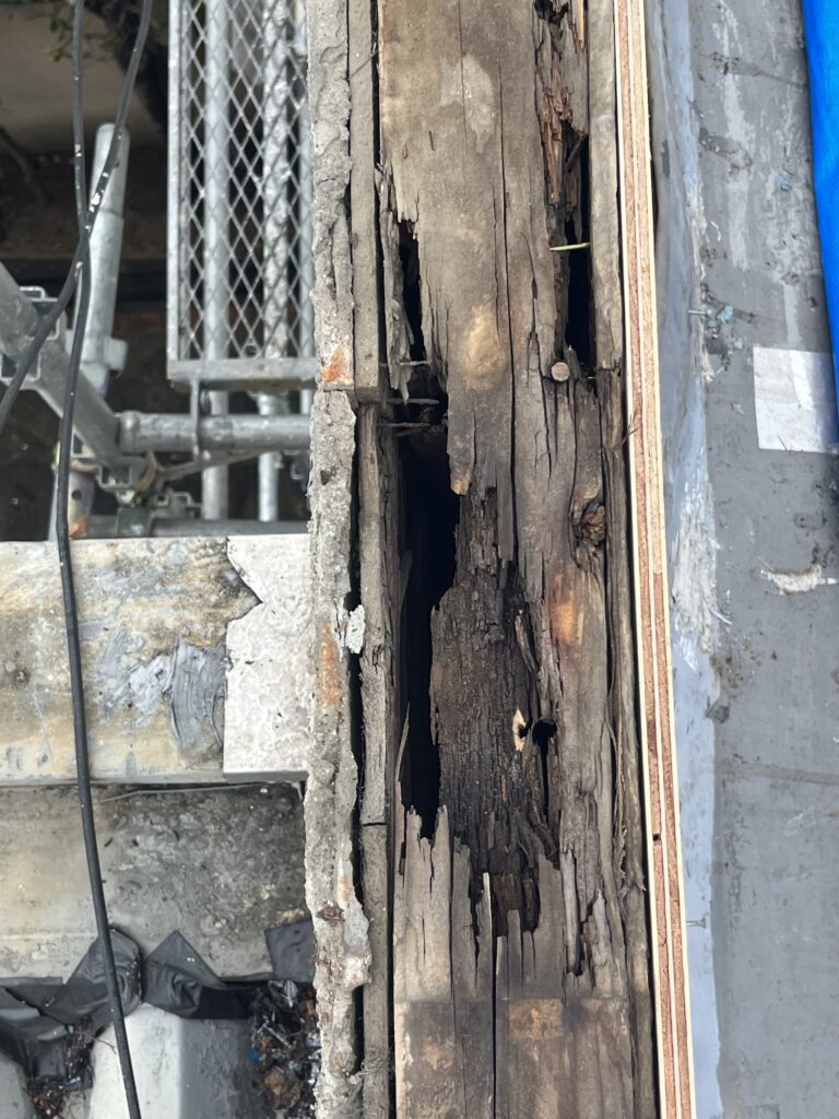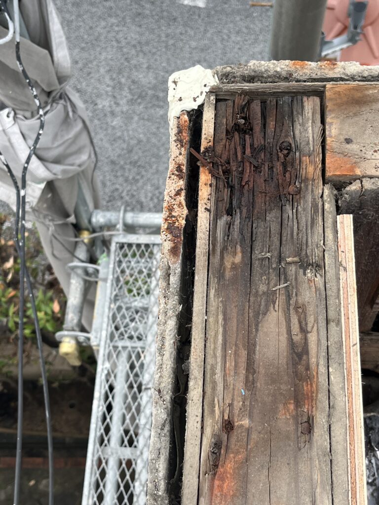 外側のブリキを外してみると長年の傷みで中の木が傷んでいました。