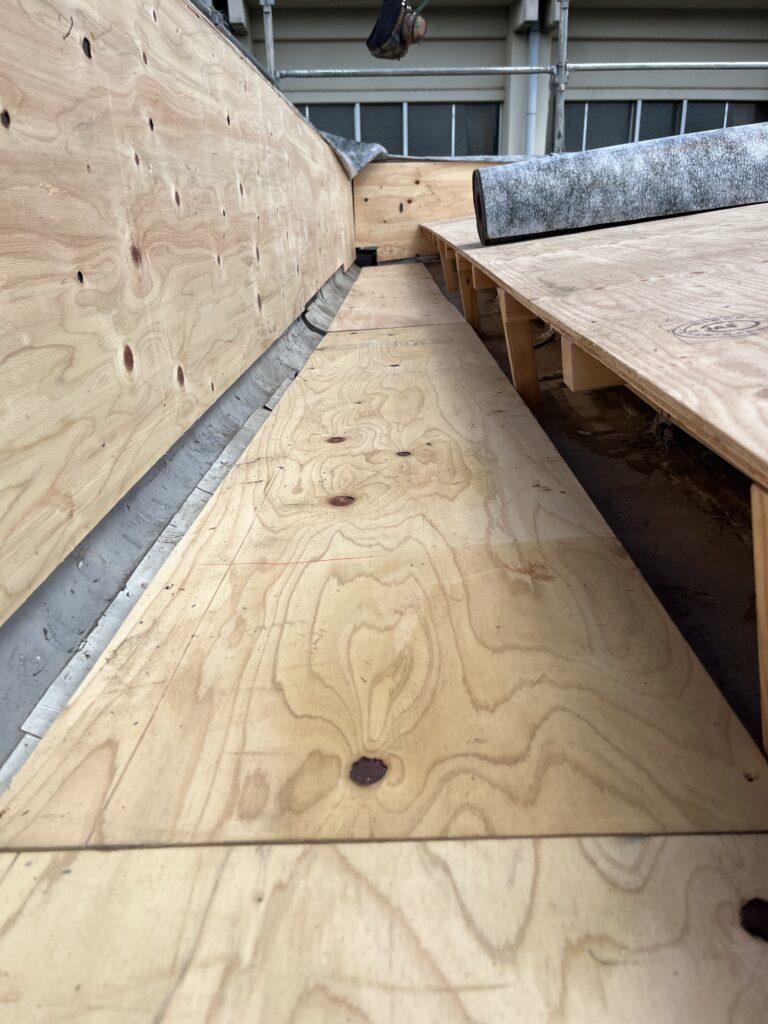 材木で下地を作った後は、谷を入れて屋根を貼っていきます。